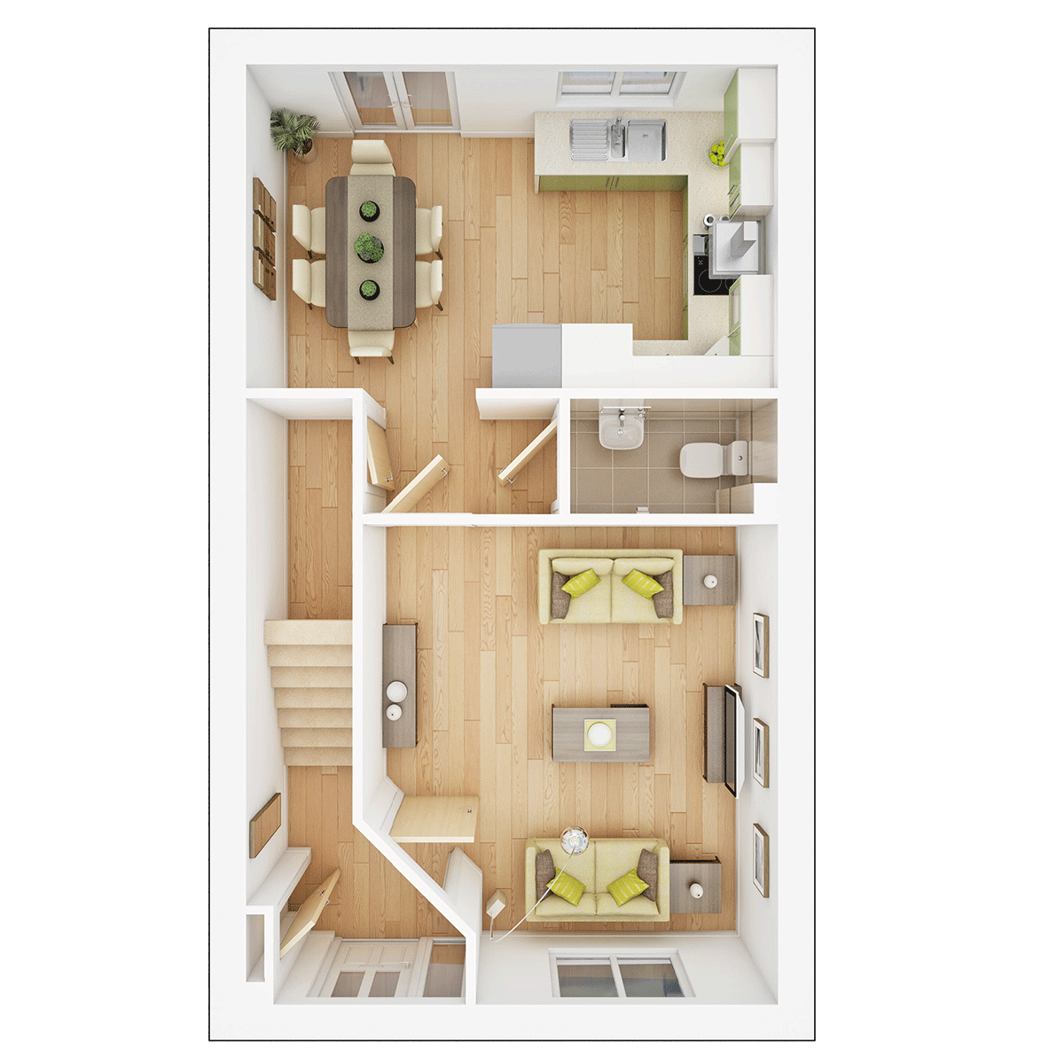 The ground floor of the Gosford features an open-plan kitchen diner to the rear, with double doors that open on to the garden. The cosy lounge is located to the front of the home.