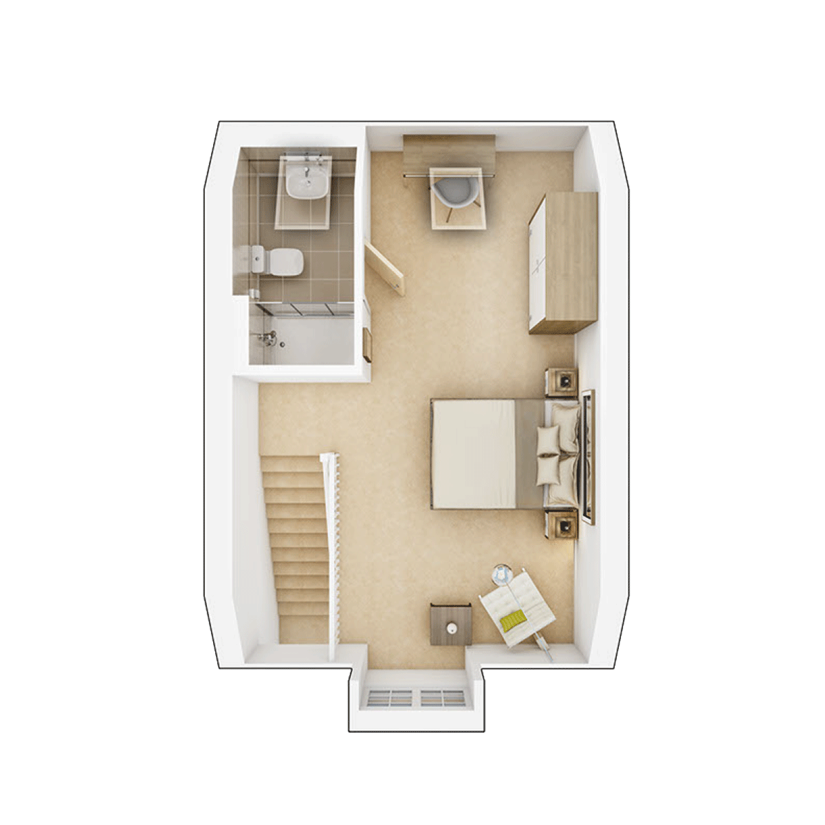 The second floor is home to the main bedroom. The bedroom spans the entirety of the space and includes a spacious en suite bathroom.