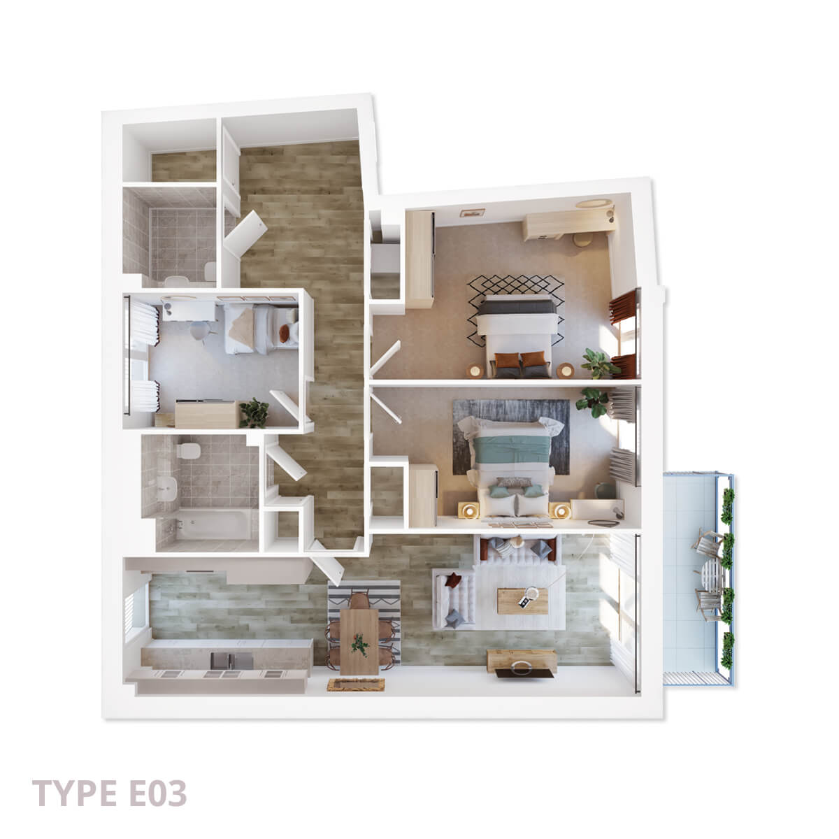 This contemporary 3 bedroom apartment has floor to ceiling windows throughout, helping to make the most of the light throughout the day. The open plan kitchen/living/dining area allow access to a private balcony - perfect for socialising with friends and family.