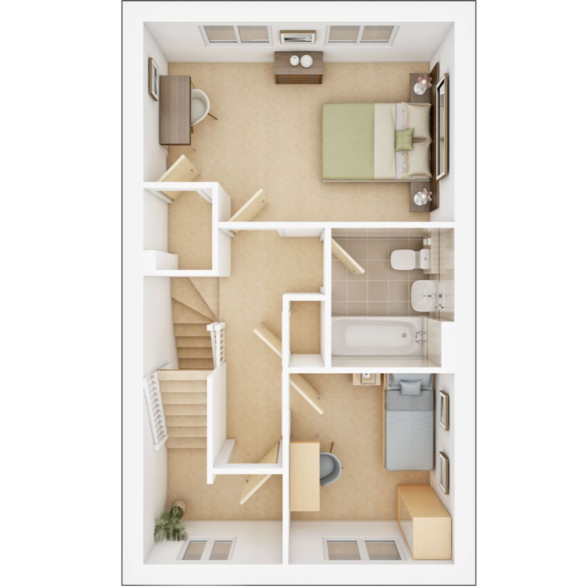 On the first floor you will find bedroom 2, 3 and the family bathroom.