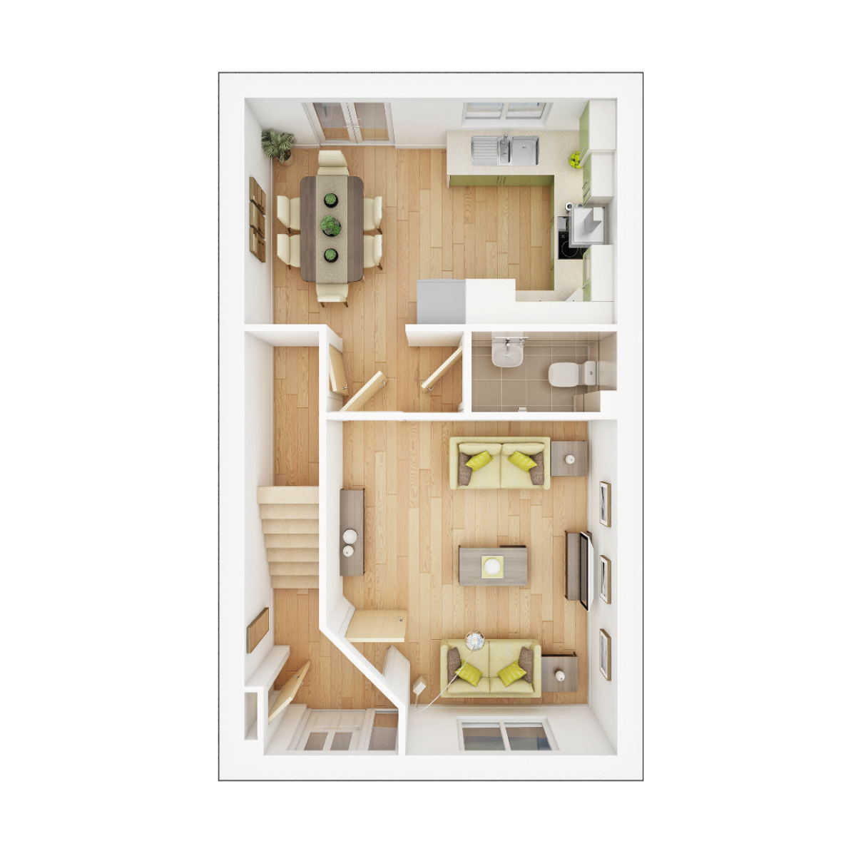 The ground floor of the Gosford features an open-plan kitchen diner to the rear, with double doors that open on to the garden. The cosy lounge is located to the front of the home.